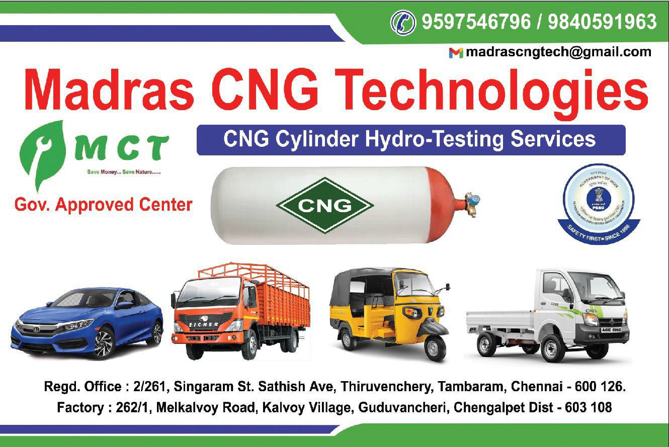 Madras CNG Technologies is a government-approved center offering professional CNG Cylinder Hydro-Testing Services in Guduvancheri, Chengalpet District. We specialize in hydrostatic testing, ultrasonic thickness testing, borescope inspections, and thorough cylinder cleaning to ensure safety and compliance with Gas Cylinder Rules, 2004 and IS 8451:2009.
