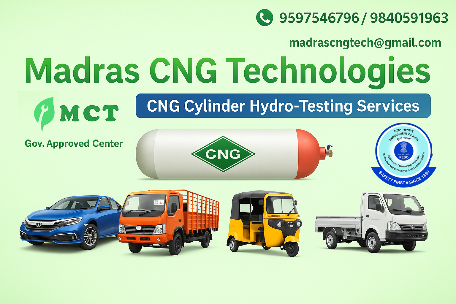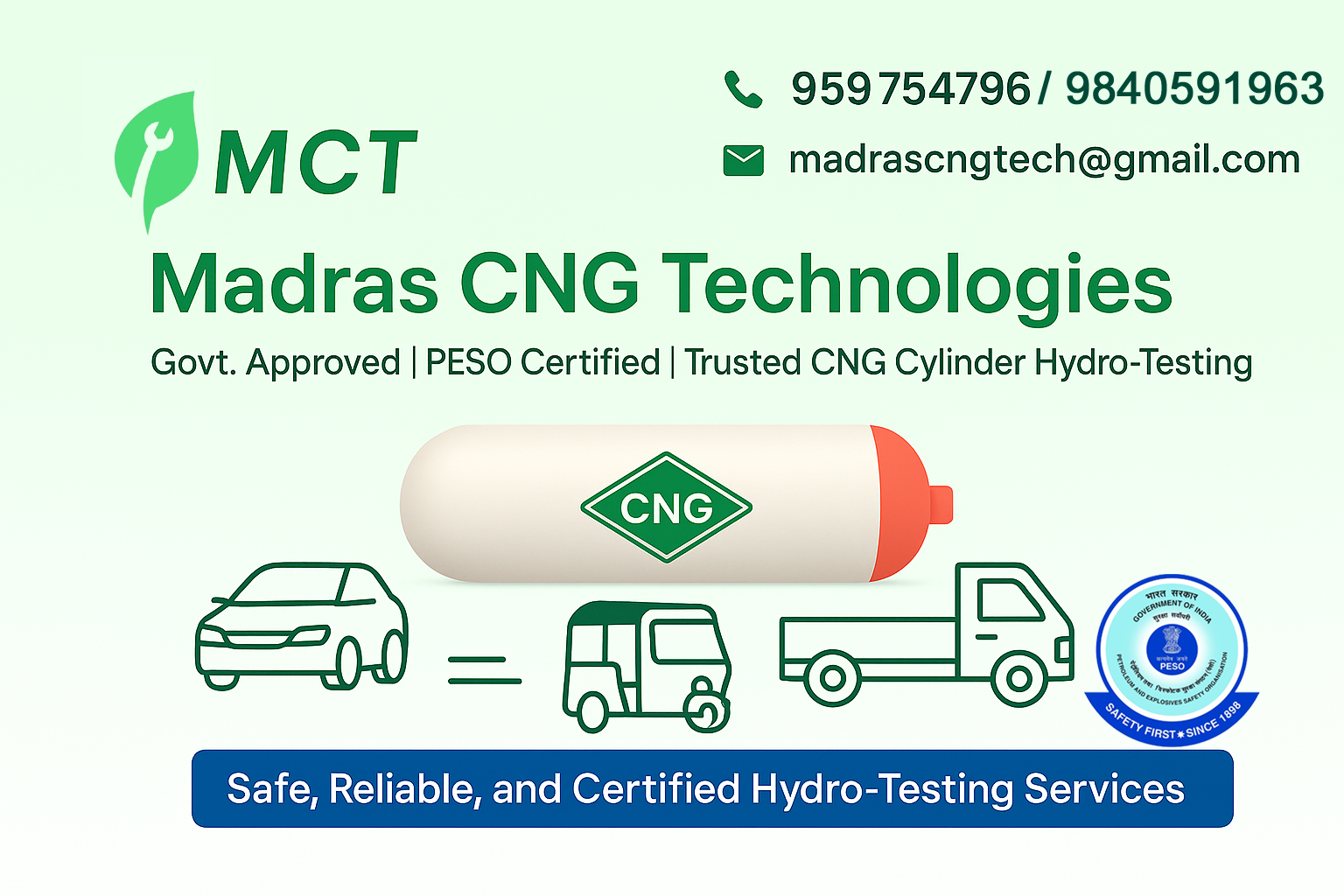 With advanced equipment and skilled technicians, we help keep your CNG cylinders safe, reliable, and legally certified. Trust Madras CNG Technologies for dependable service and a safer tomorrow.